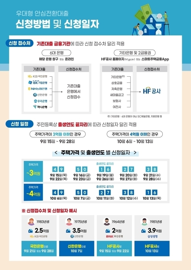 기존 대출이 KB국민·IBK기업·NH농협·신한·우리·하나은행의 6대 은행 대출인 경우 해당 은행 창구 또는 모바일 앱, 기존 대출이 그 외 은행 및 2금융권 대출이라면 공사 홈페이지(hf.go.kr) 또는 스마트주택금융 App에서 신청 접수. 특히 기존 대출이 여러 금융기관에 걸친 다중채무자는 대환 예정 대출 중 첫째 대출 금융기관을 기준 삼아 신청·접수처 결정.