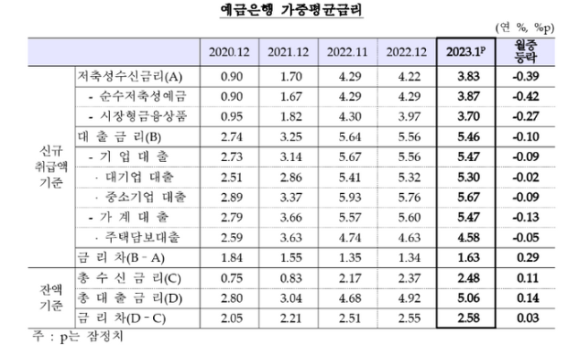 기업대출 금리는 5.47%로 0.09%p 하락했다. 대기업대출이 5.30%p로 0.02%p, 중소기업대출이 5.67%로 0.09%p 내렸다.