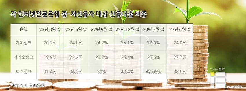 [IE 금융] 올해 상반기 인터넷전문은행(인터넷은행) 3사의 중·저신용 대출 비중이 전년 상반기보다 상승한 것으로 집계됐다.