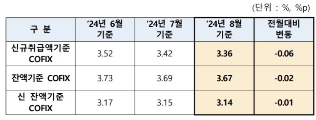 같은 달 잔액 기준 코픽스는 3.67%로 전월보다 0.02%p 내려갔다. 신 잔액기준 코픽스도 전월 대비 0.01%p 떨어진 3.14%다.