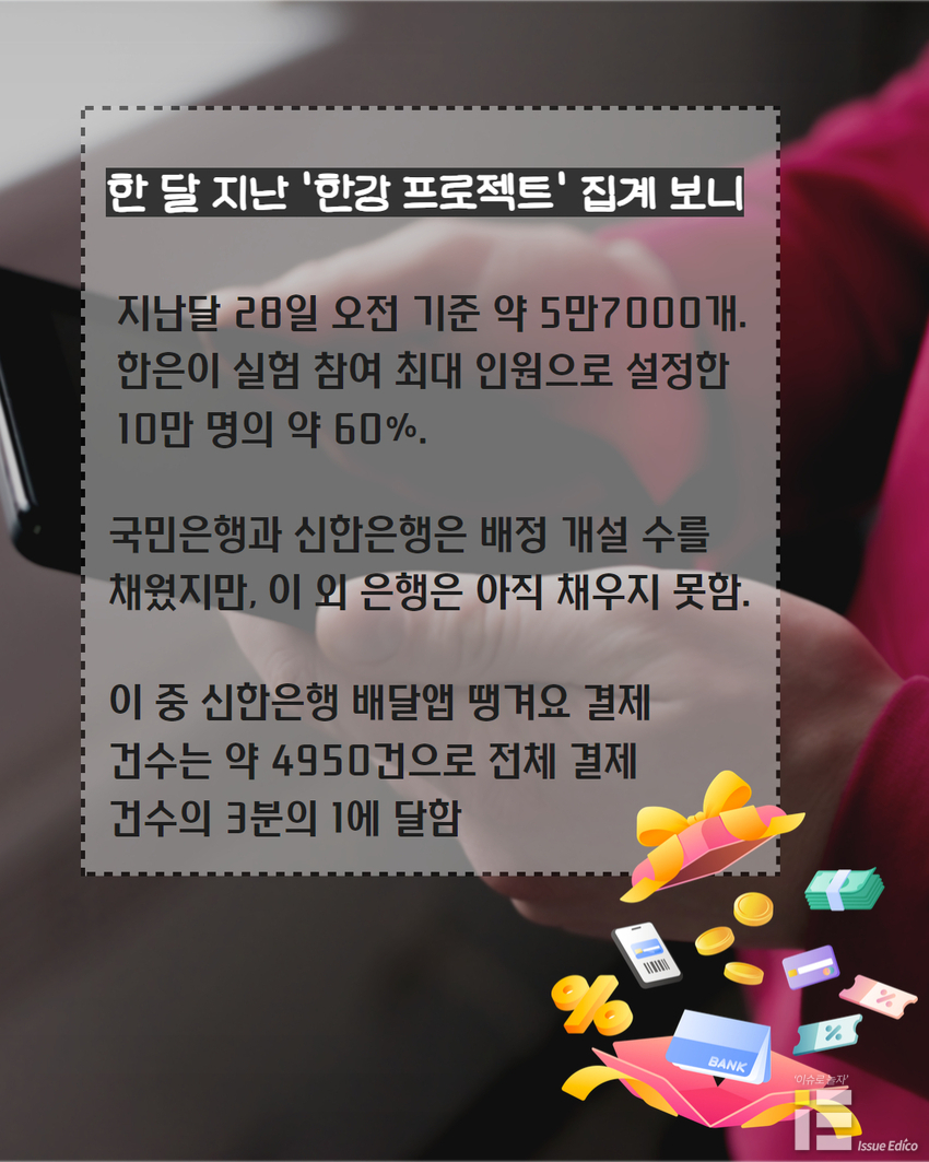 [IE 금융] 한국은행(한은)의 '예금토큰' 테스트를 위한 '프로젝트 한강'이 한 달 동안 진행된 가운데 개설된 지갑 수가 약 5만7000건인 것으로 나타났다. 또 결제 3건 중 1건이 신한은행 배달 애플리케이션(앱) '땡겨요'에서 이뤄졌다.