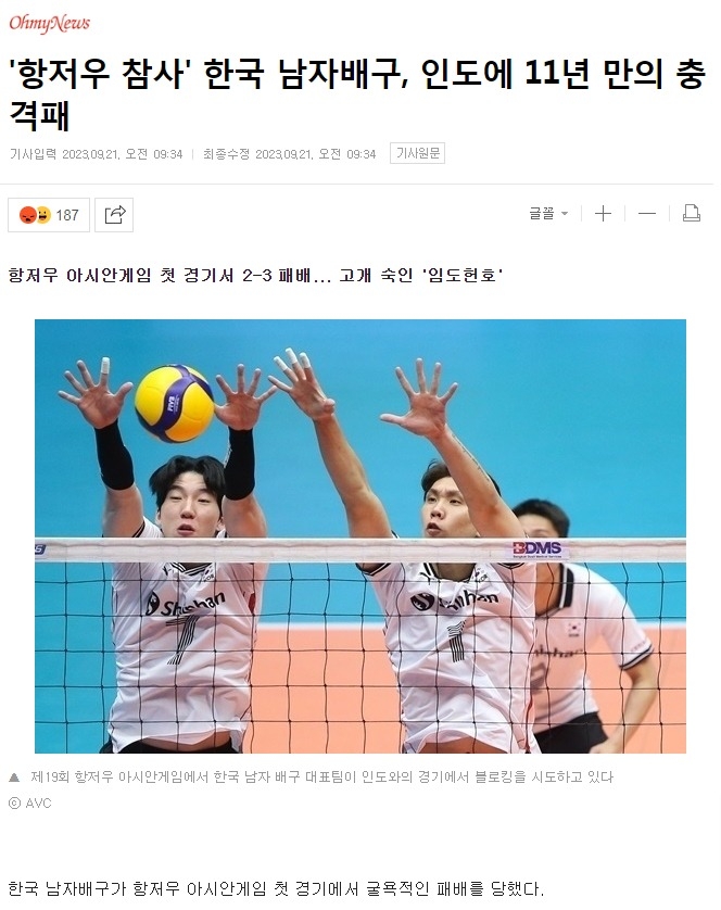 임도헌 감독이 이끄는 한국 대표팀은 20일 중국 항저우 린핑 스포츠센터에서 열린 제19회 항저우 아시안게임 남자 C조 예선 첫 경기에서 인도에 세트 스코어 2-3(27-25 27-29 22-25 25-20 15-17)으로 패배. 세계랭킹 27위 한국은 2006년 도하 대회 이후 17년 만의 금메달을 목표로 이번 대회에 나섰으나, 첫 경기부터 한 수 아래로 여겼던 세계랭킹 73위 인도에 패배. 프로 선수가 출전한 국제대회에서 한국이 인도에 패한 것은 2012년 베트남에서 열렸던 아시아배구연맹(AVC)컵 경기 이후 무려 11년 만.