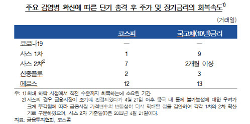 회복 속도 측면에서 과거 사례를 살펴보면 세계보건기구(WHO)가 각 감염병에 대한 최초 상황보고서를 작성한 날을 기준으로 메르스(메르스는 국내에서 보고서 작성한 날을 기준)는 코스피지수가 충격 직전 수준을 회복하는데 12거래일이 걸렸다.