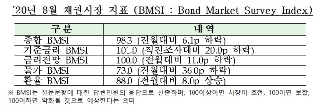 기준금리 채권시장지표(BMSI)는 101로 전월 121보다 21포인트 하락했다. BMSI지표는 100 이상이면 호전, 100이면 보합, 100 이하면 악화될 것으로 예상한다는 의미다.