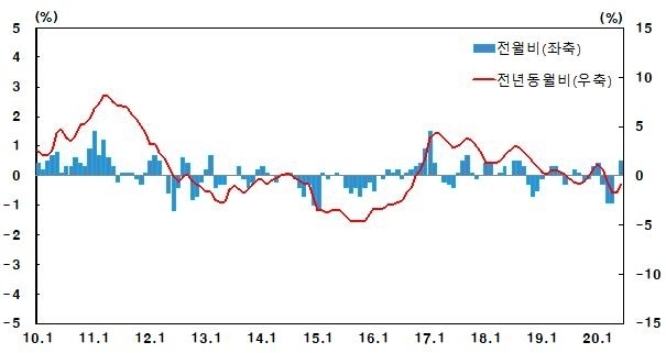 이 지수는 지난 2~4월까지 연속 내리다가 5월 재난지원금 효과 덕분에 보합, 다시 상승 전환했다. 다만 이달 생산자물가지수는 전년 동월 대비 0.9% 하락했다.