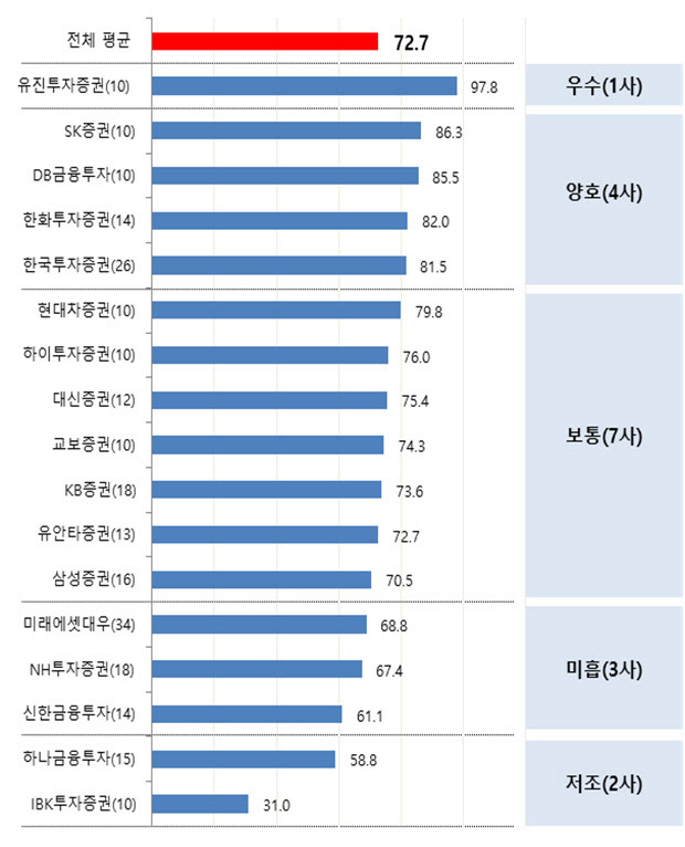 보통 등급은 ▲현대차증권(79.8점) ▲하이투자증권(76.0점) ▲대신증권(75.4점) ▲교보증권(74.3점) ▲KB증권(73.6점) ▲유안타증권(72.7점) ▲삼성증권(70.5점) 등 7곳이었다.