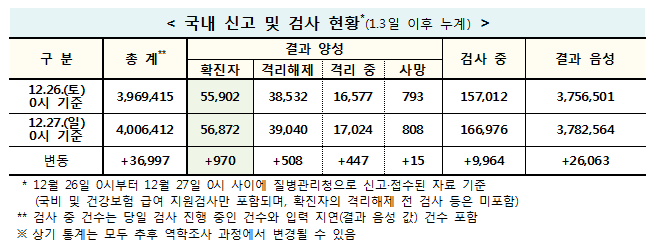 질병관리청 중앙방역대책본부는 27일 자정 기준 코로나19 확진 환자 수가 970명 증가해 총 누적 확진자 수가 5만6872명이라고 알렸다. 신규 확진자 중 946명은 국내 발생, 24명은 해외 유입으로 잠정 확인됐다.