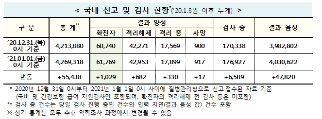 이날 사망자는 17명 발생해 누적 사망자는 917명, 전체 치명률은 전일 대비과 같은 1.48%였다. 격리 해제된 환자는 682명으로 총 4만2953명이 됐다. 위중·중증 환자는 현재 354명이다. 아울러 코로나19 진단검사는 확진자를 합쳐 426만9318명이 받았으며 이 중 403만622명에게 음성 판정이 내려졌다. 나머지 17만6927명에 대한 검사는 아직 끝나지 않았다.