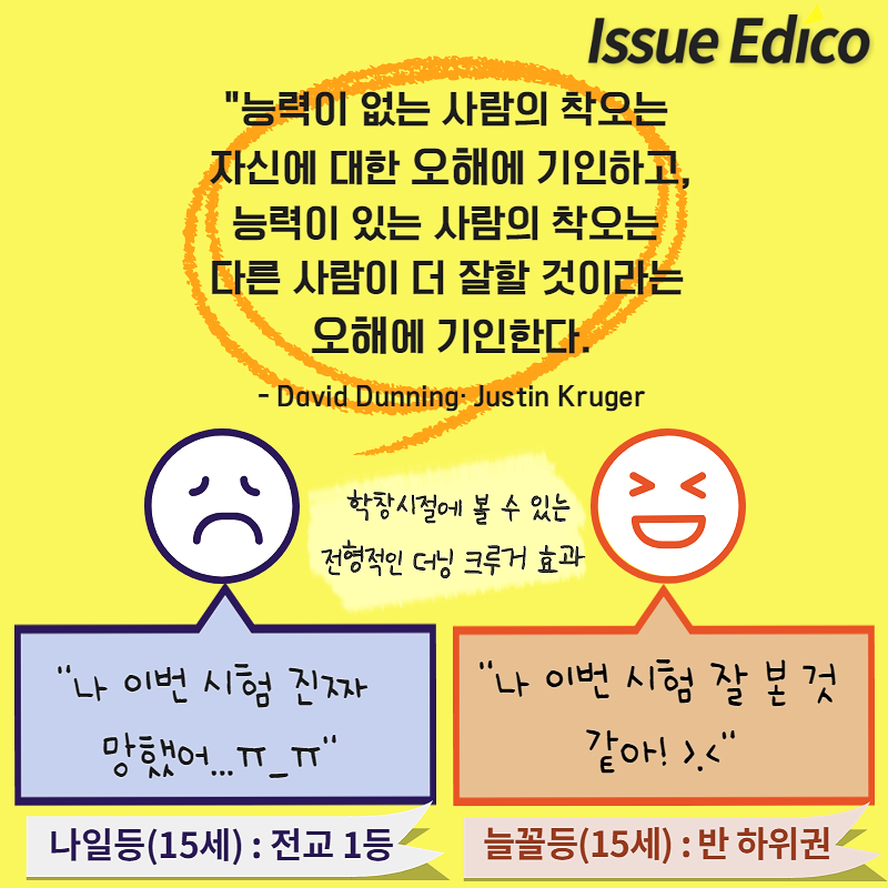 이렇듯 낮은 점수를 받은 학생들이 등수를 높게 평가하는, 흔히 말하는 '근자감(근거 없는 자신감)'을 '더닝 크루거 효과(Dunning Kruger effect)'라고 합니다. 무지한 사람들은 자신의 부족함을 인지할 능력이 없기 때문에 자신을 과대평가하고 자신만만한 태도를 갖게 한다는 것이죠.