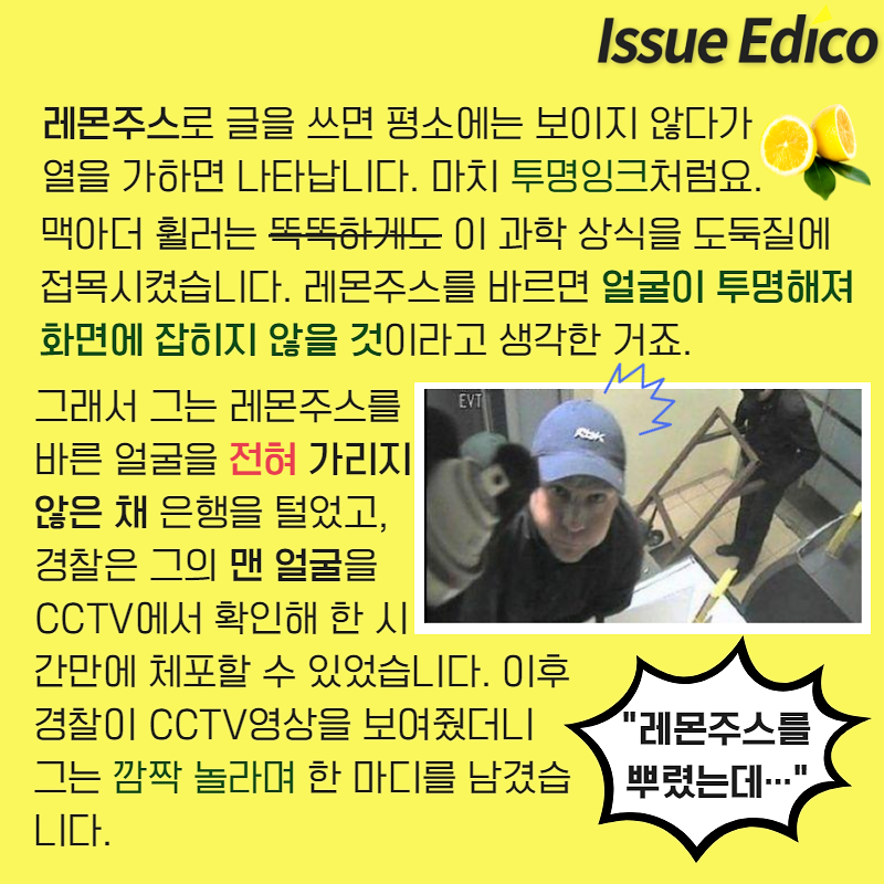 그래서 그는 레몬주스를 바른 얼굴을 하나도 가리지 않고 은행을 털었습니다. 이에 경찰은 그의 맨 얼굴을 CCTV에서 확인해 그를 한 시간만에 추적할 수 있었죠. 체포당한 그에게 경찰이 CCTV영상을 보여줬더니 그는 깜짝 놀라며 한 마디를 남겼습니다. "레몬주스를 뿌렸는데…"