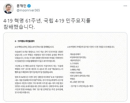 이와 함께 문 대통령은 "4·19 혁명의 주역들께 김수영 시인의 시 한 구절을 다시 바친다"며 '푸른 하늘을'을 올렸다.