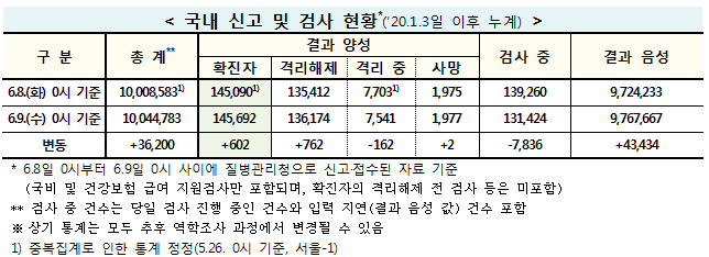 질병관리청 중앙방역대책본부는 9일 자정 기준 코로나19 확진 환자 수가 602명 증가해 총 누적 확진자 수가 14만5692명이라고 알렸다. 신규 확진자 중 581명은 국내 발생, 21명은 해외 유입으로 잠정 확인됐다.