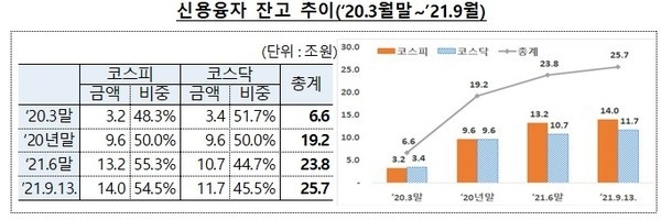 27일 금융감독원(금감원)에 따르면 지난해 3월 말 기준 6조6000억 원이었던 신용거래융자는 이달 13일 기준 25조7000억 원으로 약 3.9배 증가했다. 또 지난달 신용거래 관련 반대매도 금액은 일평균 84억8000만 원으로 연중 최대치였다.