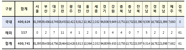 이날 국내 추가 확진자 발생 지역은 ▲서울 8만1395명 ▲부산 3만9436명 ▲대구 1만6749명 ▲인천 2만8453명 ▲광주 1만422명 ▲대전 8812명 ▲울산 1만362명 ▲세종 2032명 ▲경기 9만4806명 ▲강원 9649명 ▲충북 1만3751명 ▲충남 1만3702명 ▲전북 1만5390명 ▲전남 9309명 ▲경북 1만6780명 ▲경남 2만1896명 ▲제주 7680명이다. 이 가운데 수도권은 20만4654명을 기록했다.
