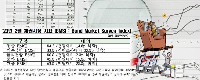 이달 2일부터 5일까지 조사한 이 자료에서 종합 채권시장지표(BMSI)는 84.2에 그쳐 전월 99.0보다 떨어졌다. 종합적으로 주요국 긴축정책 장기화와 함께 경기 불확실성 확대 탓에 물가·환율 부문 2월 채권시장 심리가 위축됐다는 진단이다.