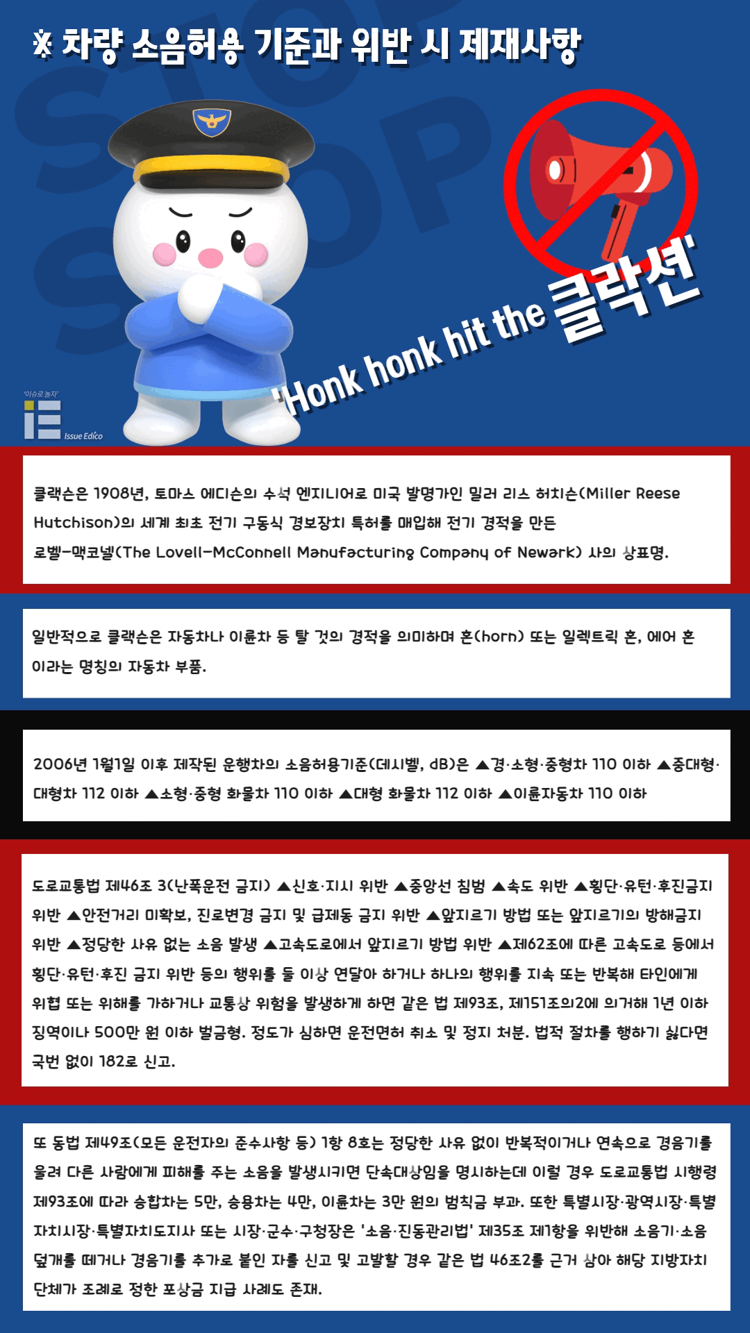 -또 동법 제49조(모든 운전자의 준수사항 등)의 1항 8호는 정당한 사유 없이 반복적이거나 연속적으로 경음기를 울려 다른 사람에게 피해를 주는 소음을 발생시키면 단속대상임을 명시하는데 이럴 경우 도로교통법 시행령 제93조에 따라 승합차는 5만 원, 승용차는 4만 원, 이륜차는 3만 원의 범칙금 부과. 또한 특별시장·광역시장·특별자치시장·특별자치도지사 또는 시장·군수·구청장은 '소음·진동관리법' 제35조 제1항을 위반해 소음기·소음덮개를 떼거나 경음기를 추가로 붙인 자를 신고 및 고발할 경우 같은 법 46조의2를 근거 삼아 해당 지방자치단체가 조례로 정한 포상금 지급 사례도 존재. |