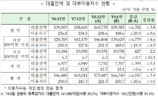 26일 금융위원회(금융위)와 금융감독원(금감원)이 내놓은 '상반기 대부업 실태조사'에 따르면 대부이용자 수는 지난 6월 말 기준 200만7000명으로 전년 말 221만3000명보다 20만6000명(9.3%) 감소했다.
