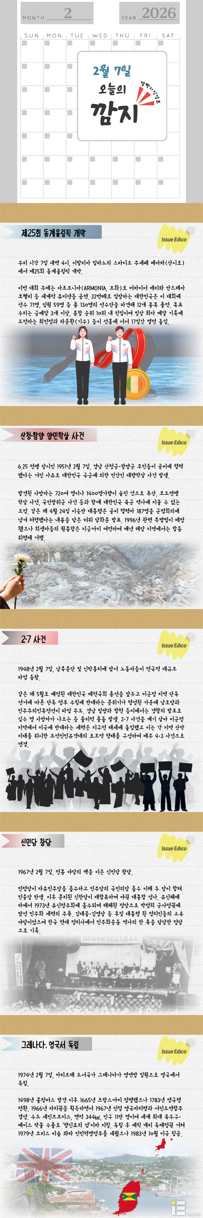 1974년 2월 7일, 카리브해 도서국가 그레나다가 영연방 일원으로 영국에서 독립. 1498년 콜럼버스 발견 이후 1665년 프랑스까지 점령했으나 1783년 영국령 전환. 1966년 자치권을 획득해 1967년 인접 영국자치령과 서인도연합주 결성. 수도 세인트조지스, 면적 344㎢, 인구 11만 명이며 세계 최대 육두구·메이스 작물 수출로 '향신료의 섬'이라 지칭. 독립 후 에릭 게리 독재정권 거쳐 1979년 모리스 비숍 좌파 인민혁명정부를 수립했으나 1983년 10월 미국 침공.