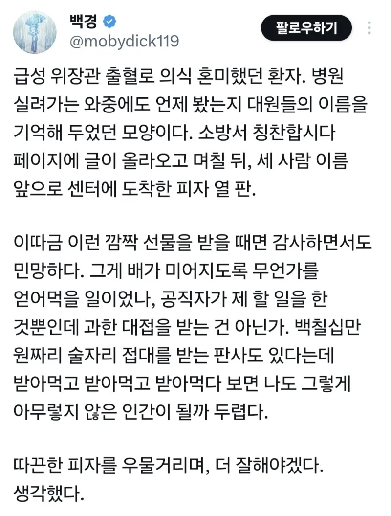 병원으로 이송해준 119대원들 이름 기억했다가 피자열판 보내준 환자