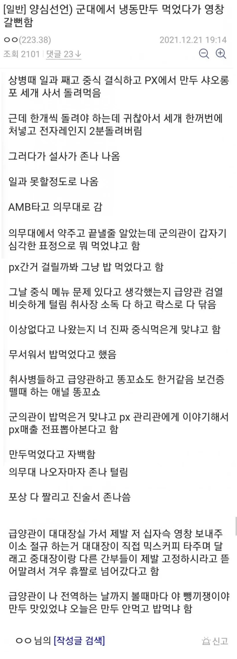 만두먹었다고 했으면 어휴 상병짬에 결식이나 하냐 하고 끝났을 일을