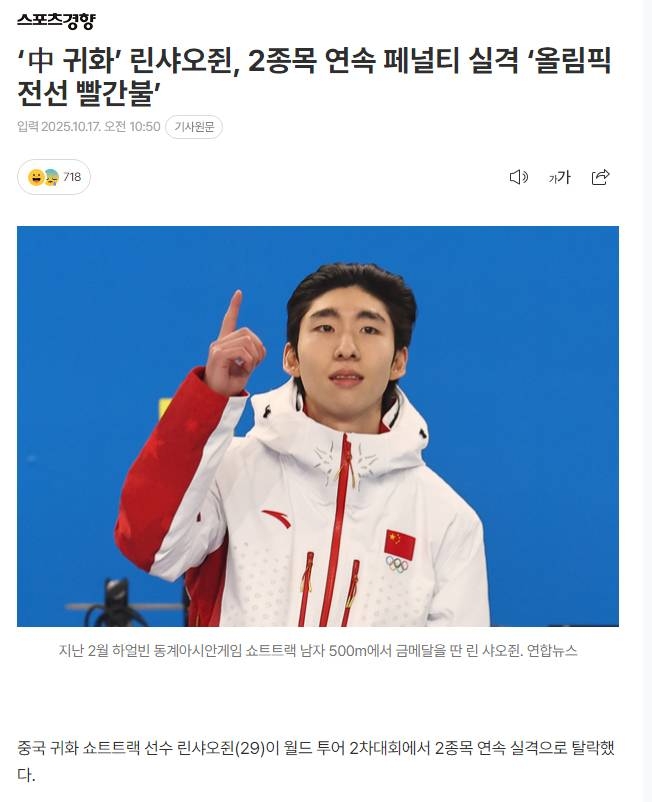 국제빙상경기연맹(ISU) 쇼트트랙 월드투어 2차 남자 500m 예선 3조에서 고대 신동민과 같은 조에서 출발해 프랑스 쿠엔틴 페르콕과 부딪혔는데 린샤오쥔의 파울로 인정돼 실격. 신동민은 41초287 조 3위로 준준결승 진출 실패. 또 린샤오쥔은 이날 1500m에서도 직선 구간 끝에서 상대 선수 진로를 막아 실격.