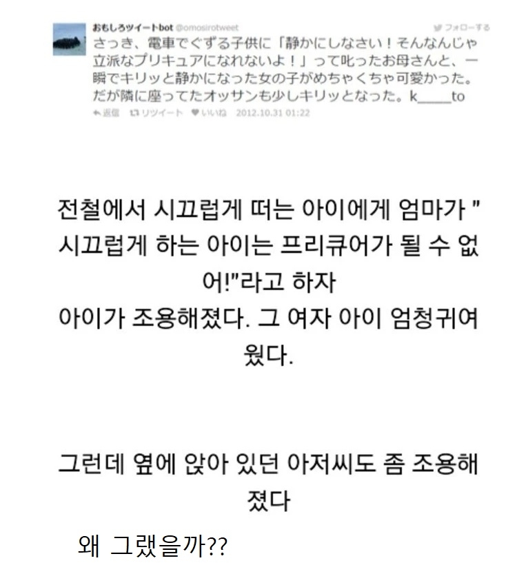 * | 지하철 안에서 여자아이를 조용히 시키는 방법. [3] | 낭인캠퍼 | 2025/10/05 |