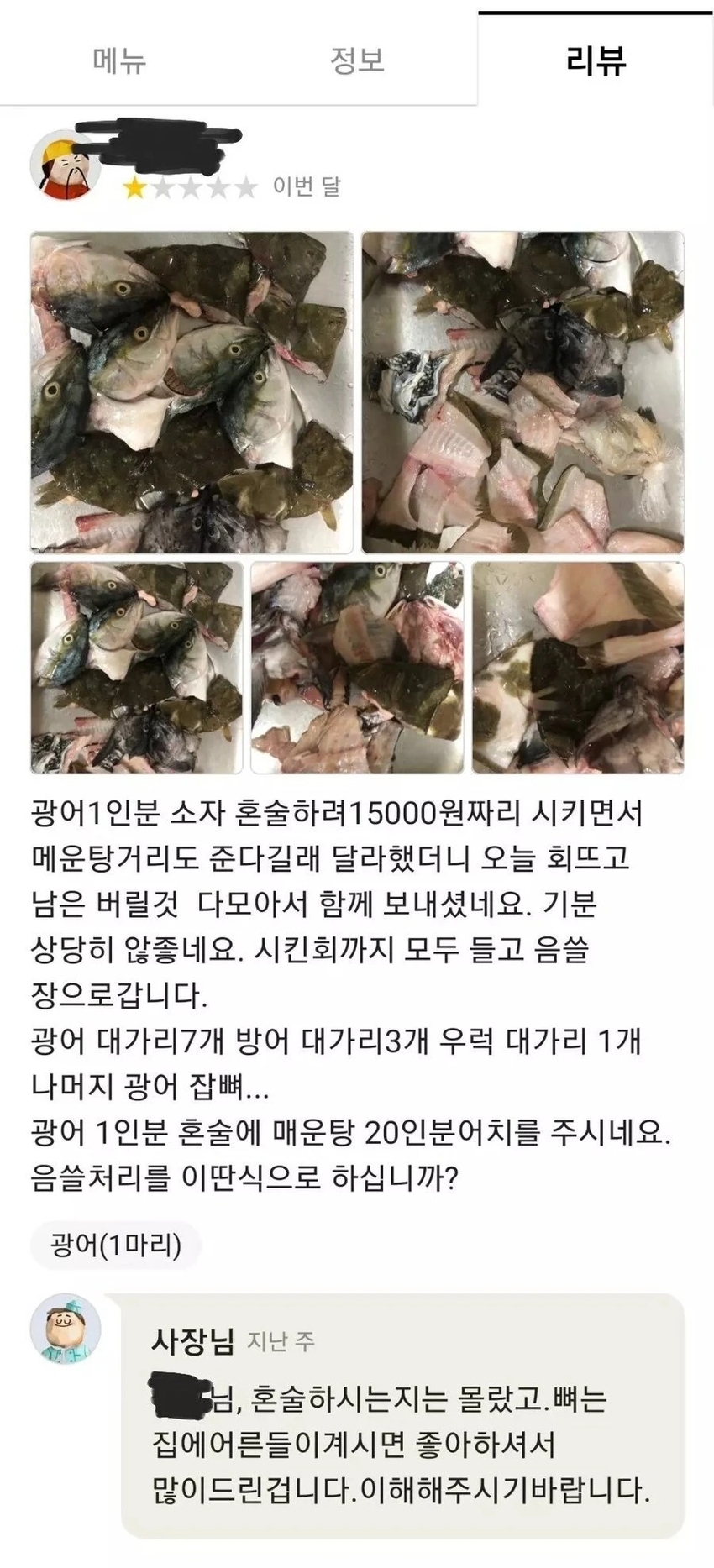 * | 광어 1인분 시켰는데 매운탕거리 20인분 보낸 횟집 [4] | 센키건 | 2025/10/12 |
