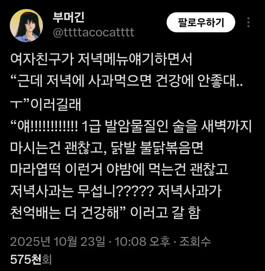 | * | 저녁에 사과 먹으면 안좋다던데 [4] | 향이있는밤 | 2025/10/27 |