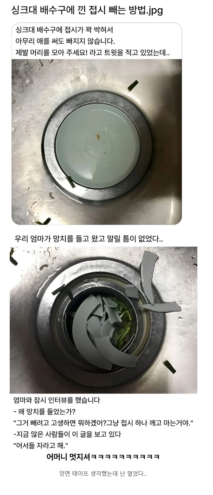| * | 싱크대 배수구에 낀 접시 빼는 방법. [3] | 금선기 | 2025/10/31 |