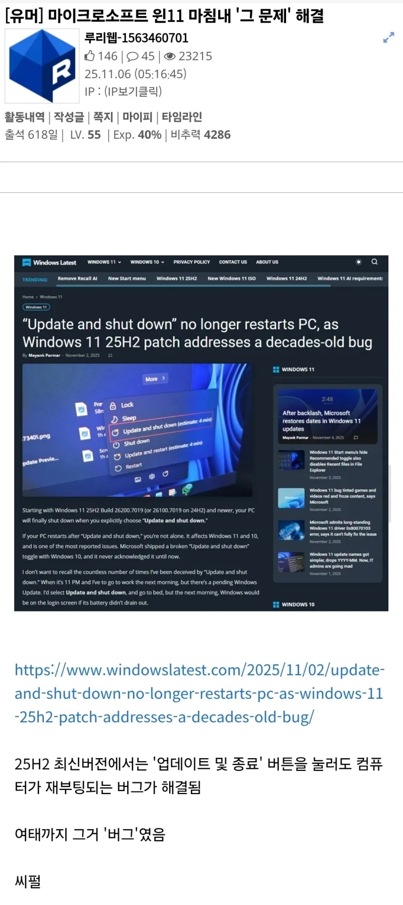 | * | 마이크로소프트 윈11 마침내 '그 문제' 해결 [4] | 낭인캠퍼 | 2025/11/07 |