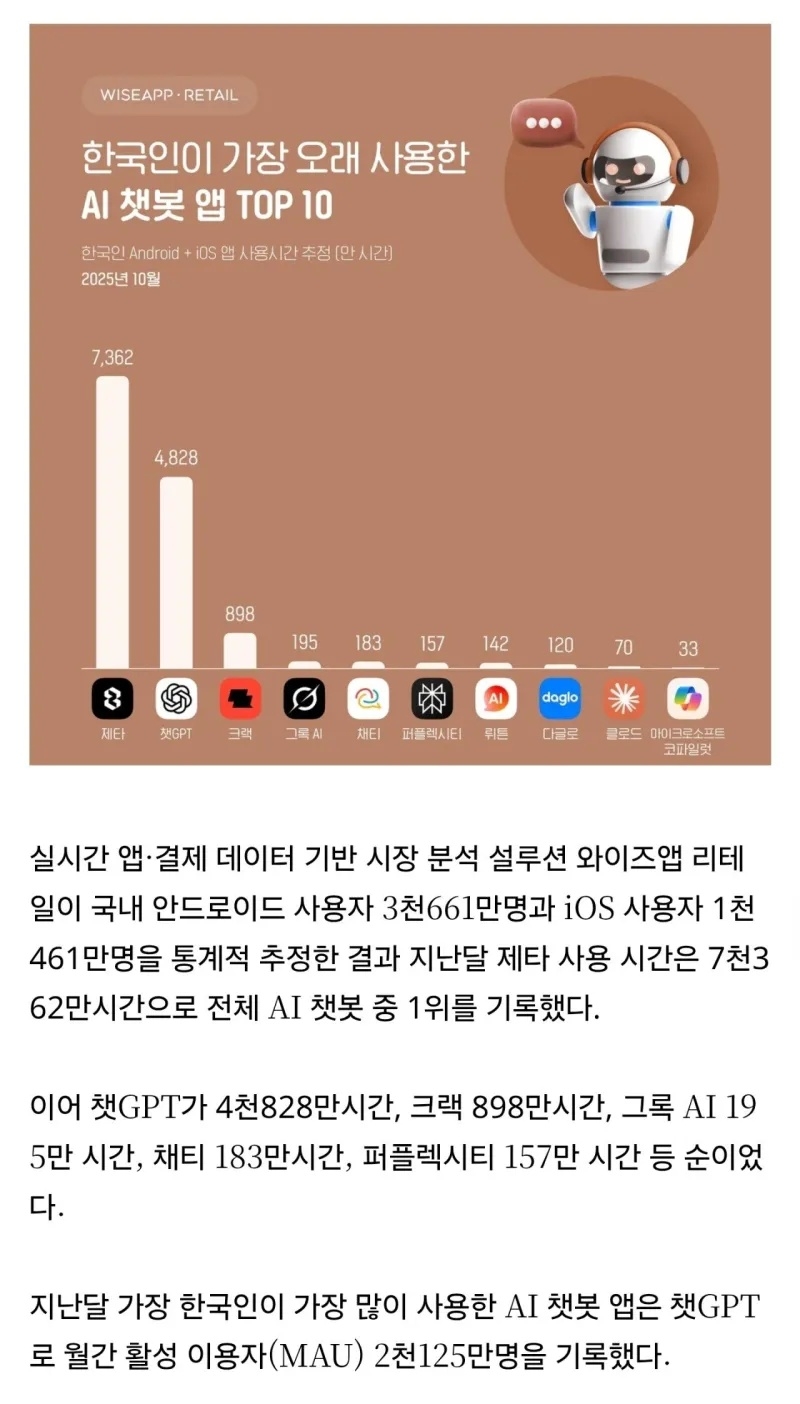 | * | 챗GPT 제쳤다 한국인 가장 오래 쓴 AI 챗봇. [4] | 낭인캠퍼 | 2025/11/14 |