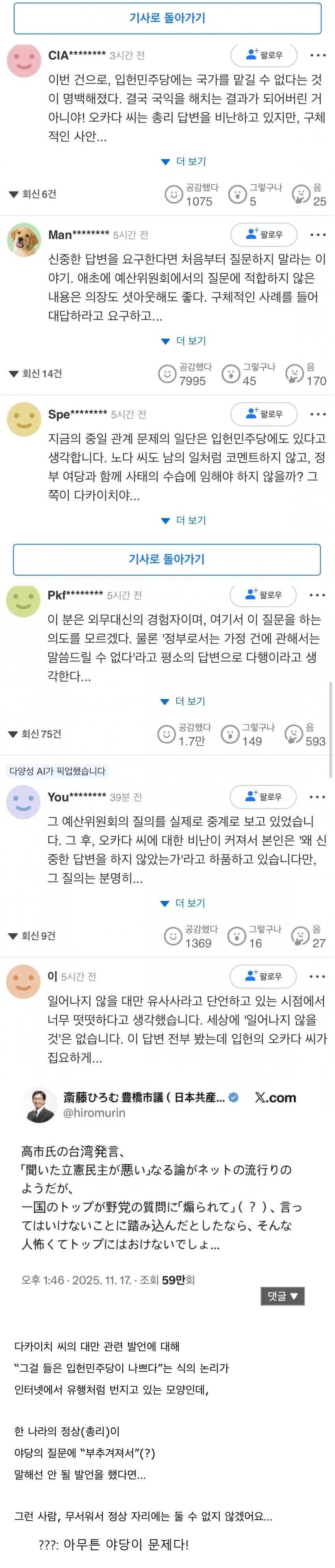 한마디로 저 질문한 놈이 나빴다고 다카이치 지지자들이 개소리 시전중