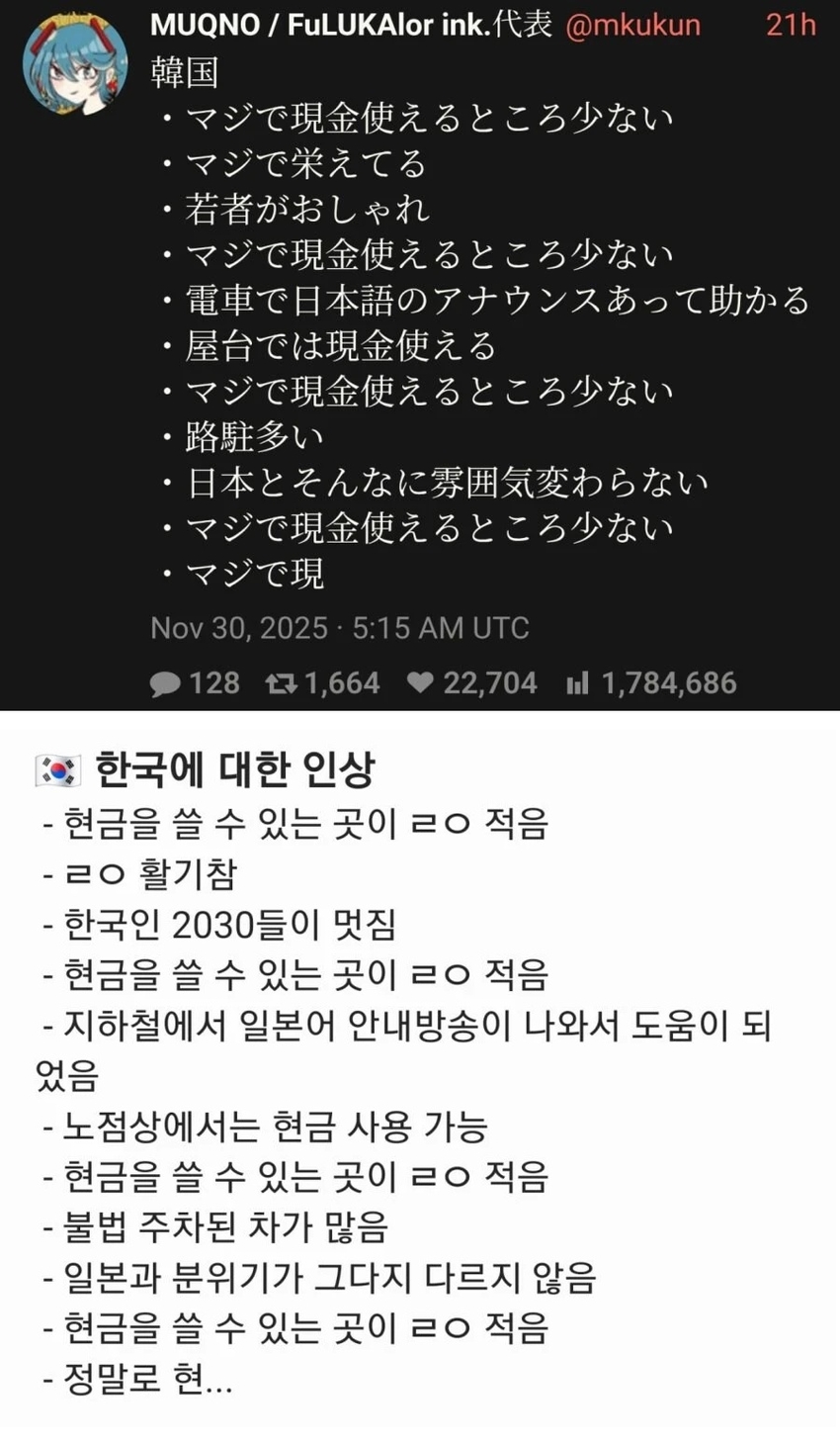 최근 한국을 다녀간 일본인의 후기.