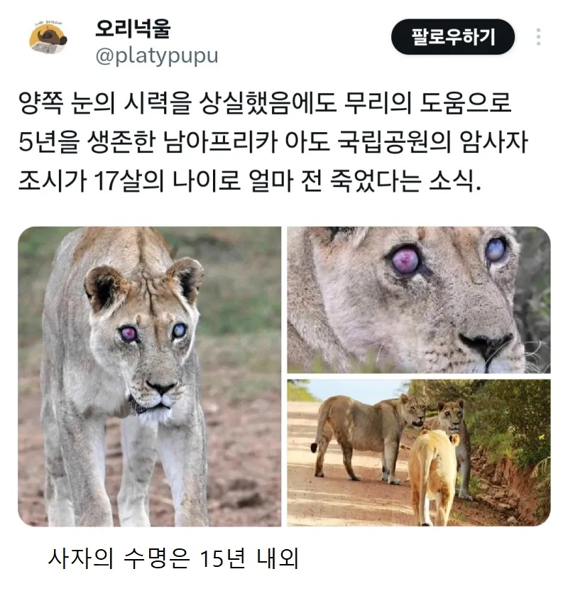 * 시력을 잃고도 천수를 누리다 죽은 야생 사자 낭인캠퍼 2025/12/14