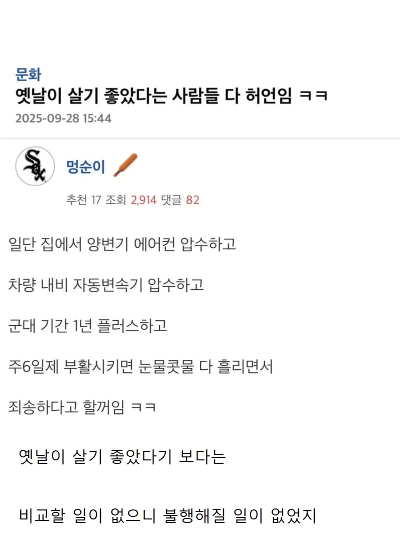 * 옛날이 살기 좋았다는 사람들 다 허언임. 금선기 2025/12/23