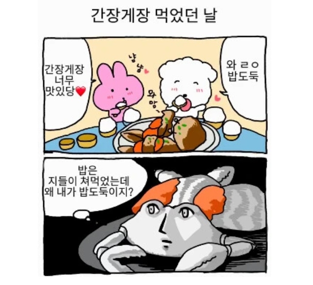 간장게장 한접시 놓고 밤새 지켜 봤는데.. 밥. 훔쳐 먹지 않던데.