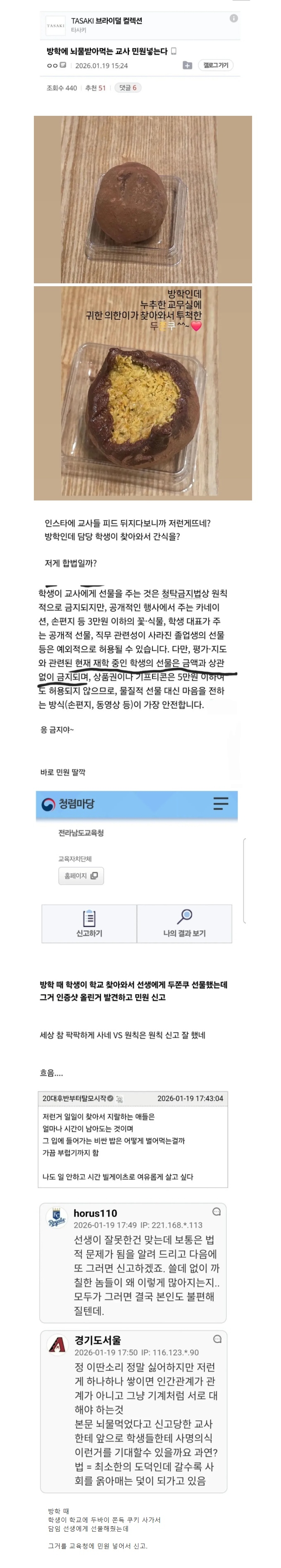 | * | 학생에게 두쫀쿠 받은 교사 민원 신고 넣음. [4] | 낭인캠퍼 | 2026/01/22 |
