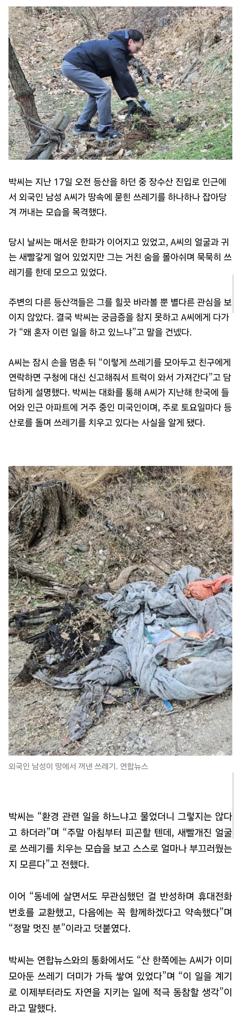 | * | 한국인이라 부끄러웠다 산 속에서 땅 파는 외국인에...韓등산객이 ‘깜짝’ 놀란 이유 [4] | 하얀물결 | 2026/01/27 |