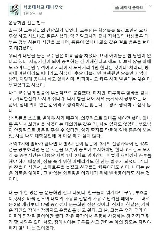 | * | 서울대 대나무숲에 올라온 매일 운동화만 신는 친구 이야기. [4] | 낭인캠퍼 | 2026/02/01 |