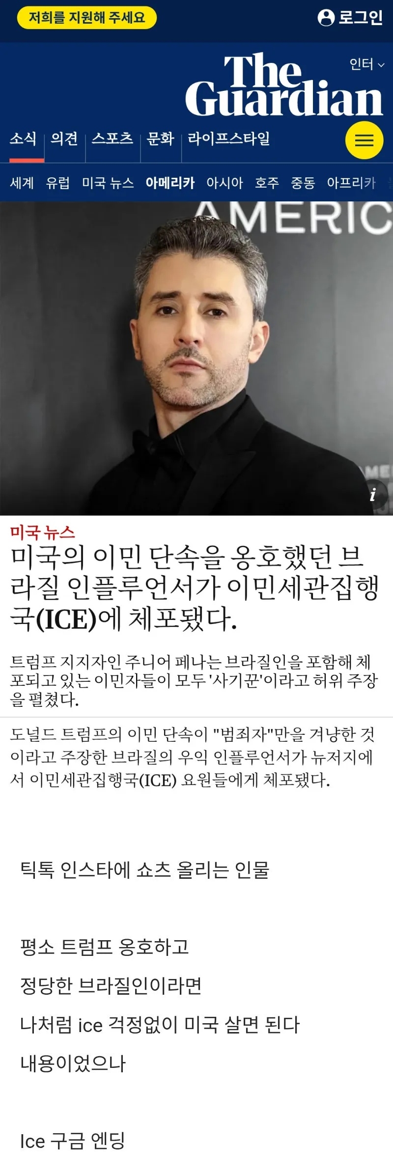| * | 트럼프 옹호하던 브라질계 인플루언서 ice에 체포됨 [4] | 기승전 | 2026/02/05 |