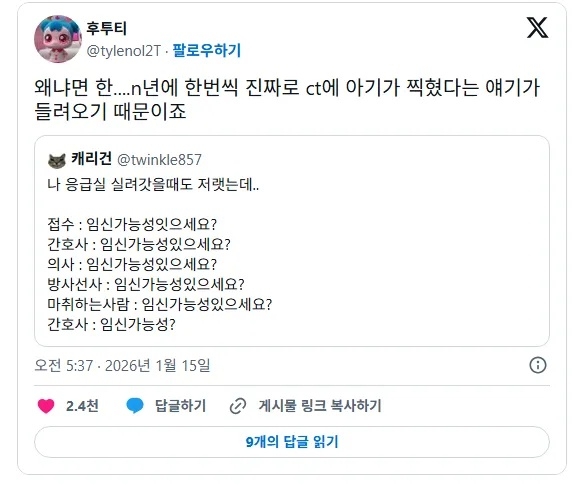 | * | 여환자가 응급실 실려오면 꼭 임신가능성 묻는 이유 [4] | 금선기 | 2026/02/26 |