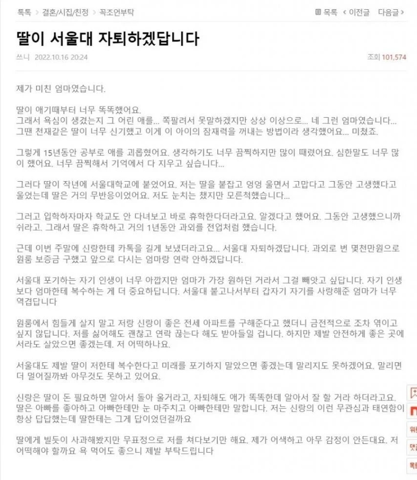 내가 딸을 서울대에 합격하게 했을정도로 능력이 있고 희생적이였다고 광고하는건가?
