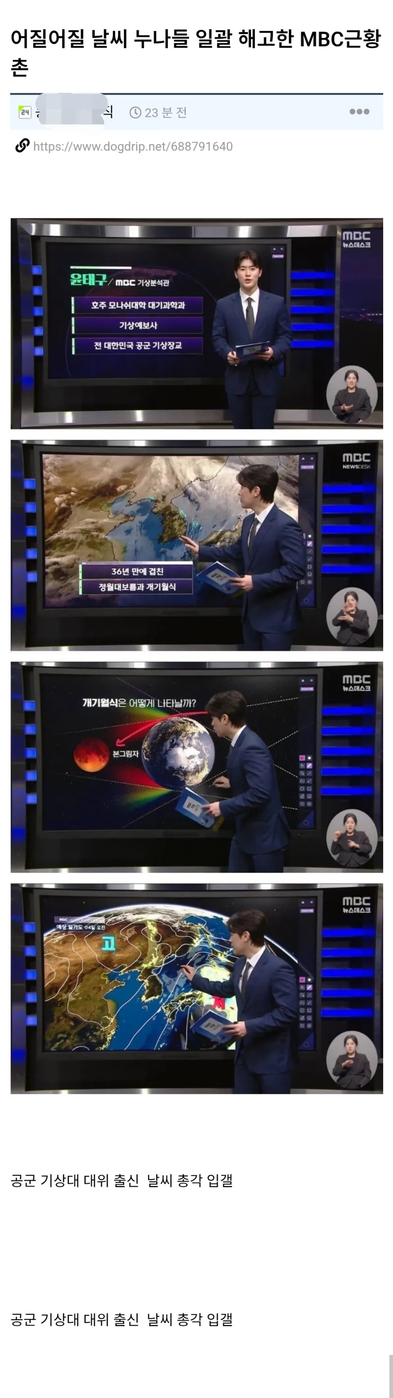 | * | Mbc 기상 예보 근황. [4] | 하얀물결 | 2026/03/05 |