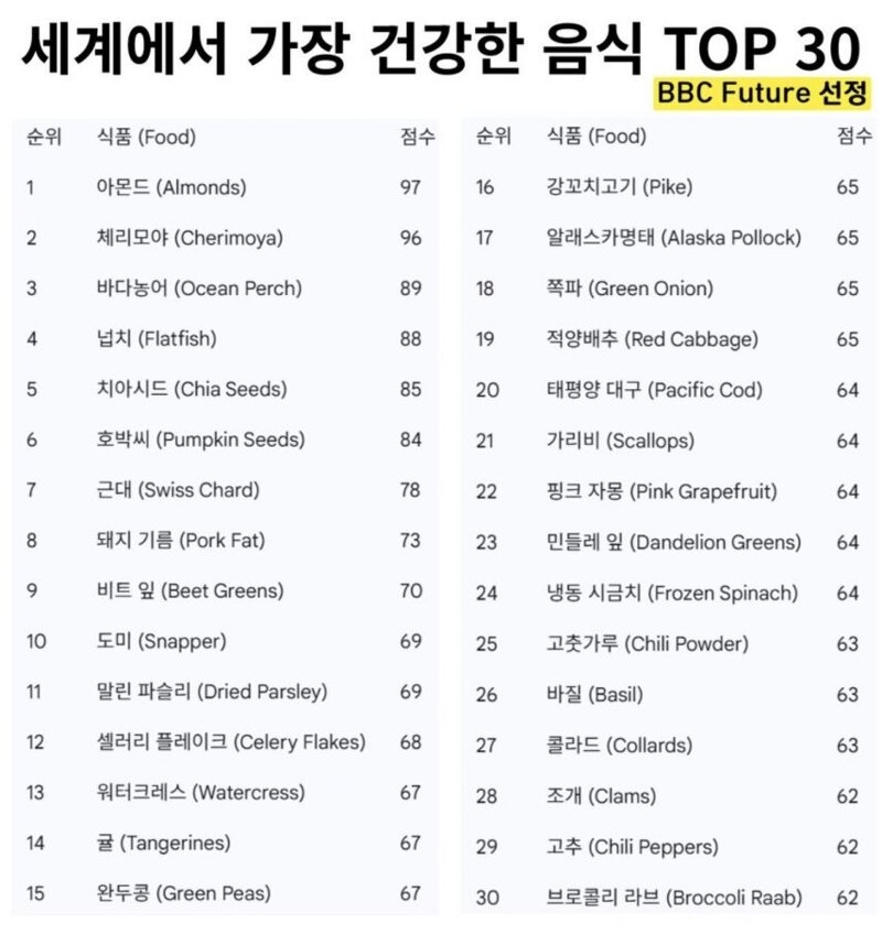 | * | BBC퓨처 선정) 세계에서 가장 건강한 음식 top30 | ionme | 2025/12/17 |