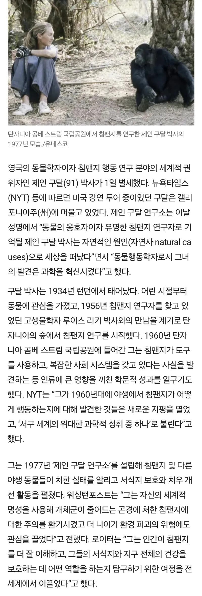 * | [애니멀] | 세계적 권위 동물학자 겸 침팬지 연구자 제인 구달 별세 [4] | 낭인캠퍼 | 2025/10/04 |