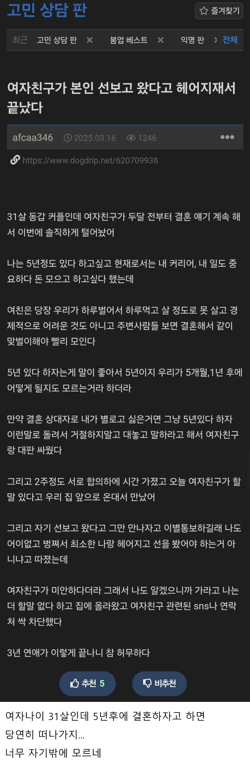 | * | [라이터] | 여자친구가 본인 선보고 왔다고 헤어지자고 해서 끝났다. | 까칠한냥이 | 2025/11/25 |