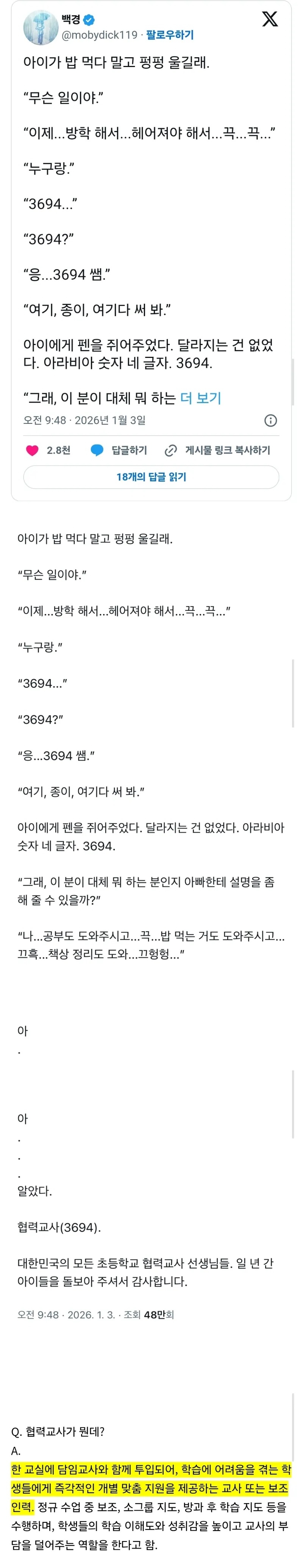 '협력교사'라는 단어가 아이들에게는 어려우니, 대충 들리는대로 3694로 알았나봐. 써보라니까 숫자 썼다잖아