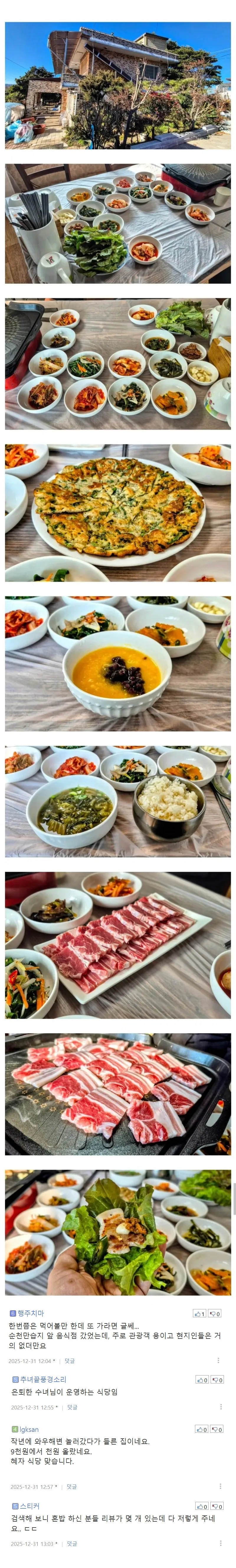혼밥가능에 차별없이 밑반찬 내줌 가격은 만원 첫댓 진짜 충격이네 순천가면 찾아갈만 하구만ㅋㅋㅋ