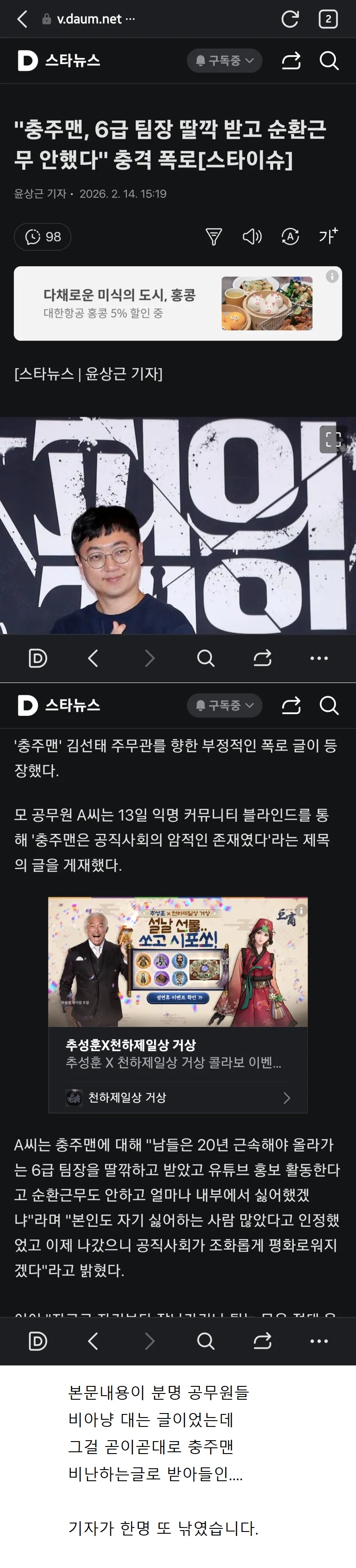 | 11536 | [트래블] | 충주맨이 남들 모르게 겪었을 고충 [4] | 준이형 | 2026/02/15 |