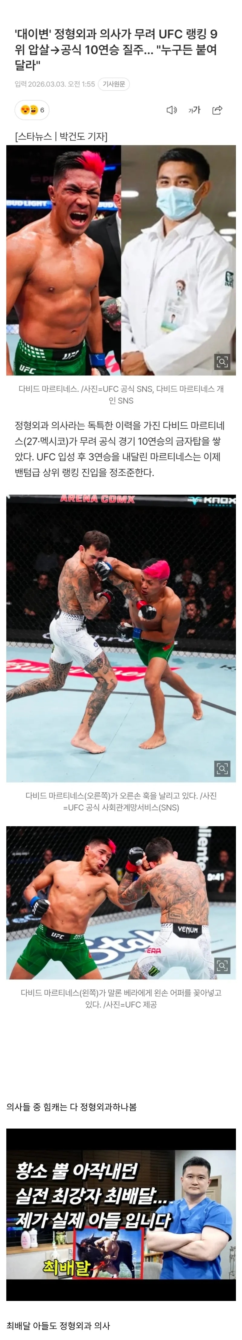 | * | [라이터] | 정형외과 의사 UFC 10연승 질주 누구든 붙여 달라 [4] | 하얀물결 | 2026/03/05 |